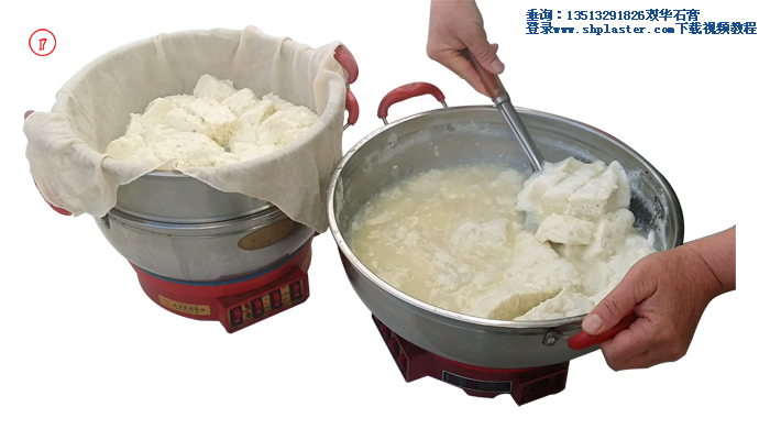 步驟12: 激烈攪拌煮開的豆?jié){,與此同時(shí)把石膏漿倒入豆?jié){中,此時(shí)豆?jié){的溫度大約在96℃左右。(溫馨提示:豆?jié){溫度越高,所用的食品級(jí)點(diǎn)石膏粉的數(shù)量越少,反之則食品級(jí)點(diǎn)石膏粉用量越多。如果豆?jié){溫度降到85℃時(shí),食品級(jí)點(diǎn)豆腐石膏粉的用量要增加到每100克干黃豆,4克食品級(jí)點(diǎn)豆腐石膏粉。)